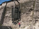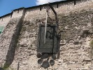 На крепостной стене Псковского кремля висит огромный меч. Одни называют его Мечом Александра Невского, другие - Мечом Довмонта, другого псковского князя. Поскольку ясности нет - я буду называть его Мечом Довмонта-Александра. Этот памятный знак установили в год 730-й годовщины Ледового побоища. Большой прямоугольный щит - воинское знамя, на котором изображены герб и план Пскова. На псковском гербе - хищный зверь с поднятой когтистой лапой, которого почему-то называют барсом. На круглых пластинах, укрепленных под щитом, гербы городов, принимавших участие в битве: Пскова, Новгорода, Владимира, Твери и Переяславля-Залесского.