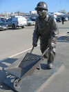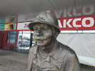 Около входа в строительный гипермаркет "Аксон", что на улице Сутырнина в Костроме расположен памятник строителю - работяга в спецовке с шикарными усами катит тачку.