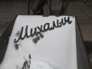 Тачка эта явно самодельная, сделанная из уголков и согнутого листа металла. На ковше тачки красуется надпись "Михалыч" - видимо, она персональная.