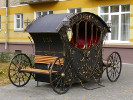 Я был у "Молодоженов" довольно давно - в 2019 году. К тому времени они, и особенно карета, потеряли свой былой лоск - краска потускнела, а на карете и вовсе облупилась, позолота исчезла. Не знаю - может за эти годы их все-таки привели в порядок.