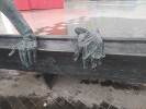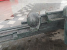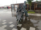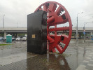 Третьим "персонажем" композиции выступает ротор проходческого комбайна, с помощью которого и осуществляется строительство туннелей. Говорят, что ротор - настоящий, это часть проходческого щита "Наталья" (почему-то сложилась традиция называть проходческие комбайны женскими именами). Вот только известно, что продолжение Солнцевсой линии тоже делала "Наталья". Конечно, может быть, что в данном случае износился сам ротор и его заменили целиком (обычно меняют только его зубья). А вот название производителя проходческого щита на табличке точно выбито с ошибкой (см. фото). На самом деле уважаемая немецкая компания, производящая тоннелепроходческие комплексы, называется Herrenknecht AG, по фамилии ее основателя. Несолидно как-то…