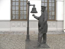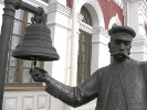 Справа от входа в вокзал стоит "начальник станции", и ударом в колокол готовится дать сигнал об отправлении поезда. На самом деле это был не просто удар, а целый ритуал, строго расписанный в уложении "Колокола на станциях". Сигналов было три (совсем как "звонков" в театре). Первый (одинарный) предупреждал пассажиров, что пора готовиться к посадке. Второй (два удара) предписывал им занять свои места. И только третий (соответственно, три удара) возвещал об отправлении поезда. Был еще один "регламентированный" сигнал - звон колокола (без счета ударов) сигнализировал о выходе поезда с соседней станции.