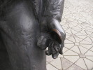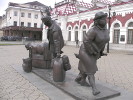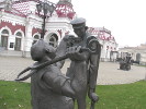 Напротив "шпалоукладчицы" расположилась колоритная пара "путейцев", прозванных екатеринбуржцами "толстый и тонкий". Видимо, они чем-то напомнают персонажей чеховского рассказа (кстати, памятники настоящим, чеховским "толстому и тонкому", есть в Таганроге и в Южно-Сахалинске). Рядом с ними стоит тележка уже с настоящими, деревянными, шпалами (кто помнит - их пропитывали креозотом, имевшим весьма специфический и не никогда не выветривающийся запах). Парочка, видимо, решила устроить перекур ("тонкий" держал в губах сигарету, а "толстый" давал "огоньку"). Вот это по-нашему - женщины машут кувалдой, а мужики устраивают перекур. Я не зря упомянул процесс прикуривания в прошлом времени - видимо, на фоне борьбы с курением сигарету и спичку спилили. А зря! Теперь совсем непонятно - чем эти работяги занимаются, и почему "толстый" протягивает руку к лицу "тонкого".