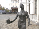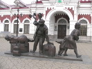 Слева от входа в вокзал проводница несет пару стаканов чая пассажирам. Кто ездил в советских поездах помнят, что подача чая тоже была ритуалом. Сначала проводник растапливал печь, которую все называли "Титан". Печь топилась древесным углем, отчего в вагоне стоял запах, который ни с чем не перепутаешь. И только после закипания кипятка проводник наливал чай и разносил его в стаканах, установленных во всенепременных, обязательных подстаканниках. Блюдечек подавать не полагалось, поэтому ложку клали прямо в стакан - как это и изобразили скульпторы.