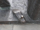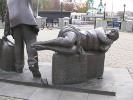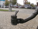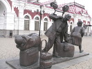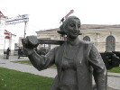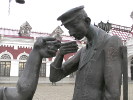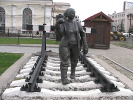 Следующий персонаж на привокзальной площади - "шпалоукладчица". Это дама пашных форм в спецовке, с платком на голове и кувалдой на плече. Видимо, это отсыл к тем временам, когда рельсы крепились к деревянным шпалам здоровенными гвоздями-костылями. Работа была тяжелая (помахай-ка целый день кувалдой!), но удивительным было то, что этой работой занимались женщины. Я сам прекрасно помню: будучи в стройотряде в казахстанском Экибастузе мы как раз работали на укладке железнодорожного полотна. А бригадиром у нас была тетя Маня - гарная дивчина, на спор вгонявшая в шпалу костыль за 3 удара кувалдой! Вы сможете забить хотя бы гвоздь с трех ударов? Вот только одна непонятная деталь со "шпалоукладчицей" - она идет по современным, бетонным шпалам, рельсы к которым прикручиваются болтами, причем еще на заводе.