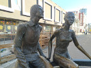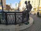 Пара сидит босиком - обувь они сняли и поставили позади парапета. И это было их ошибкой - не прошло и пары лет, как их обувку сперли то ли любители сувениров, то ли любители цветмета - сначала исчезли кроссовки юноши, а потом и босоножки девушки. Вроде как обувку восстанавливали, но она снова исчезала. И это на улице Вайнера, увешанной камерами видеонаблюдения!