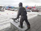 Около входа в строительный гипермаркет "Аксон", что на улице Сутырнина в Костроме расположен памятник строителю - работяга в спецовке с шикарными усами катит тачку.