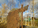 Я специально искал этот арт-объект, будучи в очередной раз в Петрозаводске осенью 2024 года. Даже не знаю почему - просто по фоткам он показался мне интересным. Это металлический лист с абстрактными рисунками, один из краев которого плавно переходит в нечто подобное кадуцею - римской палке с крылышками (он же жезл Гермеса или Меркурия).