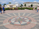 Ну и, наконец, возвращаемся к самому знаку в центре. По его окружности читаем: "Лета 2007 в год 855-летия града Костромы на память благочестивого народа, в ознаменование воссоздания Сусанинской площади с памятником царю Михаилу Федоровичу Романову и крестьянину Ивану Сусанину костромскими зодчими забит сей гвоздь". То есть, этот круг - гвоздь, вернее, его шляпка? Тогда что означают звезда, фразы о времени и загадочные цифры?