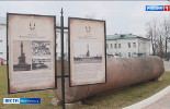 В самом центре металлический круг, размером и формой похожий на крышку канализационного люка, на котором выбиты речные волны, в расходящихся солнечных лучах - надпись КОСТРОМА.
