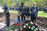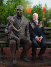 Памятник ветеранам - единственный из расположенных рядом, имеющий реального прототипа - Щербаков лепил его с Дмитрия Михайлика, председателя ветеранской организации МЧС РФ, бывшего заместителя главы Гражданской обороны СССР. Cкульптор в точности воссоздал не только внешний образ, но все его награды.