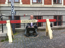 Я встречал упоминание, что памятник - передвижной и его периодически перевозят на новое место. В это трудно поверить - работяга вылезает из реальной дыры в земле и для его установки каждый раз пришлось бы не только разбирать брусчатку, но и выкапывать новую яму. Косвенным доказательством этому является то, что заботливые шведы установили около "водопроводчика" ограждение - не дай бог кто-нибудь свалится в яму.