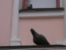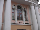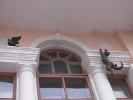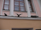 На козырьке фасада дома №4 по улице Большая Покровская (это здание Нижегородского театрального училища) две кошки пытаются поймать трех голубей. За этой охотой с интересом, очевидно думая, что его это не касается, наблюдает воробей, сидящий на подоконнике.