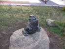 А вот о другом поверье узнали случайно. Будучи около "лягушки" осенью 2016 года, я сразу обратил внимание, что у нее вроде как чего-то не хватает. А дело в том, что некие личности, у которых руки вечно чешутся, отломали у нее палку с дорожной торбой. В начале 2017 го было решено "жабку" отреставрировать. И когдя ее сняли с постамента, из-под нее посыпались монетки и купюры - это туристы клали под нее денежку на счастье и удачное путешествие.