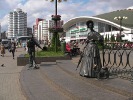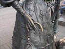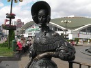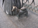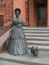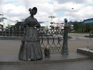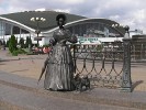 А теперь героиня Чехова, Анна Сергеевна фон Дидериц, прогуливается с ее четвероногим другом по прозвищу Шпиц около Комаровского рынка в Минске. Создал ее Владимир Жбанов в 2001 году (о нем и других его работах можно почитать на страничке, посвященной Барону Мюнхгаузену). Скульптура является своего рода цитатой из Чехова, у которого любовь двух одиноких, но созданных друг для друга душ, объединенных на небесах, началась с желания убежать от страдания и одиночества. Их случайная связь не закончилась, как следовало бы предполагать, разлукой. Любовь преобразила их, вырвав из привычного круговорота обыденного, выраженного тем самым серым забором, у которого и стоит "дама с собачкой".