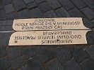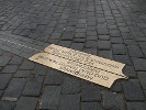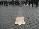 Староместская площадь (Staroměstské náměstí) - самое туристическое место в Праге, здесь всегда толпы людей и реки пива. Все смотрят по сторонам и мало кто смотрит под ноги. А зря - посередине площади в брусчатку встроен бронзовый указатель пражского меридиана (Prazsky polednik). Надпись на пластине (по-чешски и по-латыни) гласит, что "После полудня здесь можно увидеть верное пражское время". Именно в это место в полдень падала тень от Марианской колонны (Mariánský sloup) и тем самым определялось точное время.