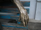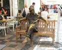 Тем не менее он пользуется довольно большой популярностью - многие жаждут присесть рядом и потереть ему что-нибудь. Судя по потертостям, больше всего трут карман плаща (неужто хотят найти что-то в плаще у бродяги?), шляпу и жмут ему руку. А некоторые норовят присесть к нему на колени.