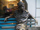 Есть памятники, о которых и сказать-то нечего - по непонятным причинам полностью отсутствует какая-либо информация. Это относится и к памятнику бродяге, который стоит, а вернее сидит, на лавочке на пересечении улиц На Мустку и Рытиржской в центре Праги. А ведь кто-то же его сделал, установил! Да и отлить бронзовую скульптуру - очень недешевое удовольствие! Тем не менее, как я ни старался, раздобыть хоть какие-то сведения об этом бродяге я не смог.