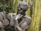 Это обобщенный образ учителя - он стоит, преклонив колено, в позе знаменитого роденовского "Мыслителя", держа в руке книгу, простреленную пулей. На постаменте выбиты слова "Несущий знания бессмертен". А в вестибюле университета на белом мраморе золотыми буквами вписаны имена восьми преподавателей, шестнадцати учителей — выпускников института и семи студентов, отдавших жизнь за нашу страну.