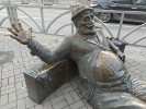 Работу выполнили С.Беляев и С.Адуашвили, отливку делали в компании "Брезгин и К". Получился довольно забавный персонаж: бомжеватый мужичок, лицом напоминающий Санта Клауса из новогодней рекламы Coca-Cola, вальяжно лежит непосредственно на тротуаре, опершись на пару чемоданов. На один из них он поставил свои башмаки, на другой "воткнул караси", или, в переводе с морского языка - повесил сушиться носки.