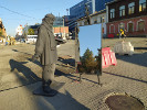 Но пишет он не пейзаж, а портрет, причем в качестве модели может выступить любой прохожий - роль мольберта выполняет шикарное зеркало. Поэтому каждый может пристроиться к зеркалу-мольберту и сделать селфи - вот ваш портрет и готов.